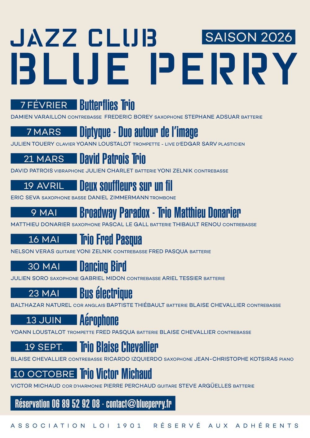 Blue Perry Jazz Club propose son espace aux adhΓ©rents pour les jam-sessions, les expositions, les concerts acoustiques ou faiblement sonorisΓ©s. Des concerts hors-les-murs sont organisΓ©s tout au long de l’annΓ©e. Blue Perry Jazz Club a Γ©galement vocation Γ collaborer avec tous les acteurs de la crΓ©ation artistique et du spectacle vivant.